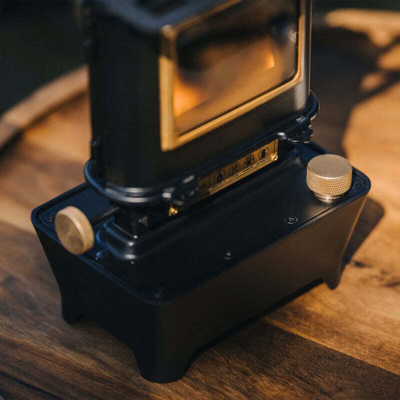 ファイヤーダンスストーブの素材はマットブラックの焼付け塗装を施した304ステンレス鋼を使用しており、耐高温、頑丈で耐久性があります。更にノブや燃料タンクの蓋、ロゴプレートにはアクセントになる真鍮を使用しており洗練したデザイン性を演出しています。