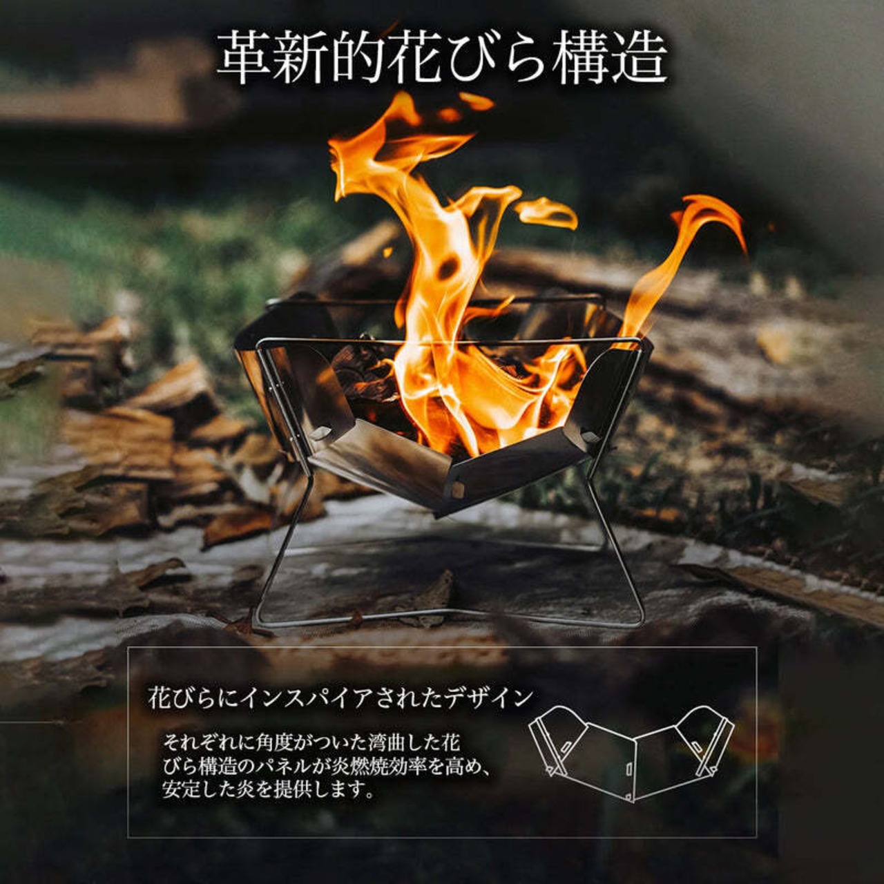 風の影響を受けやすい従来の焚き火台とは異なり、湾曲した花びらのような独自の構造が風を巧みにいなします。これにより、炎が安定し燃焼効率が飛躍的に向上しました。