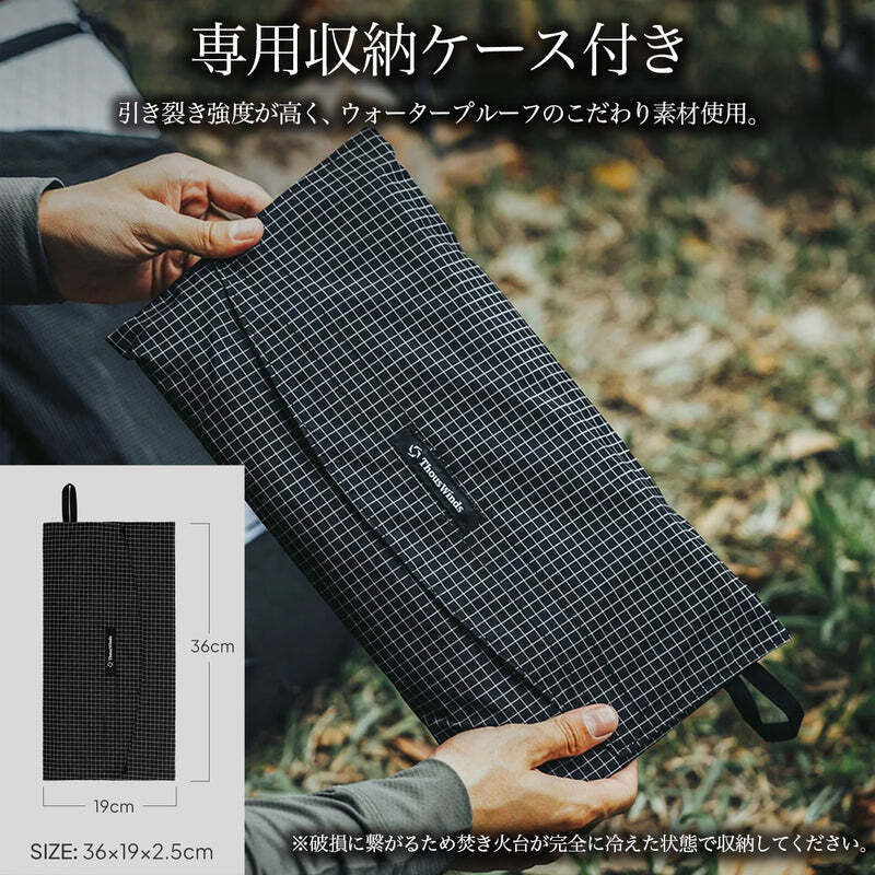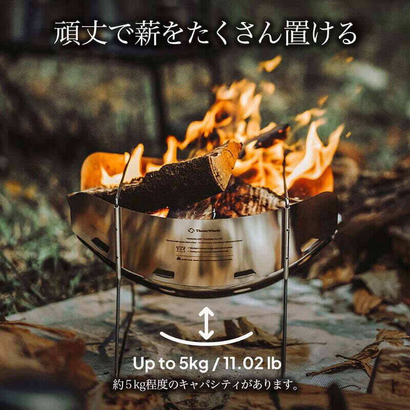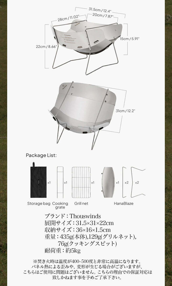 ※焚き火時は温度が400~500度と非常に高温になります。 重量や燃焼条件により熱による変形が生じる場合がございますが、 こちらはご使用に問題はございません。こちらの理由での保証対応は 致しかねます事を予めご了承下さい。