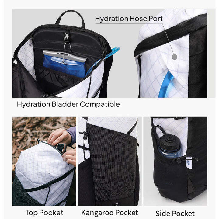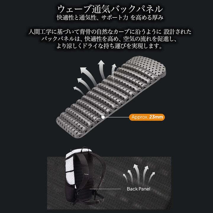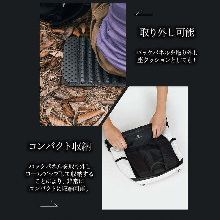 約500gの超軽量を実現。ショルダーストラップには多層パッドを使用し、快適さを損なう事のないウルトラライトデザインです。バックパネルを取り外せば、ロールアップして大変小さく収納可能です。