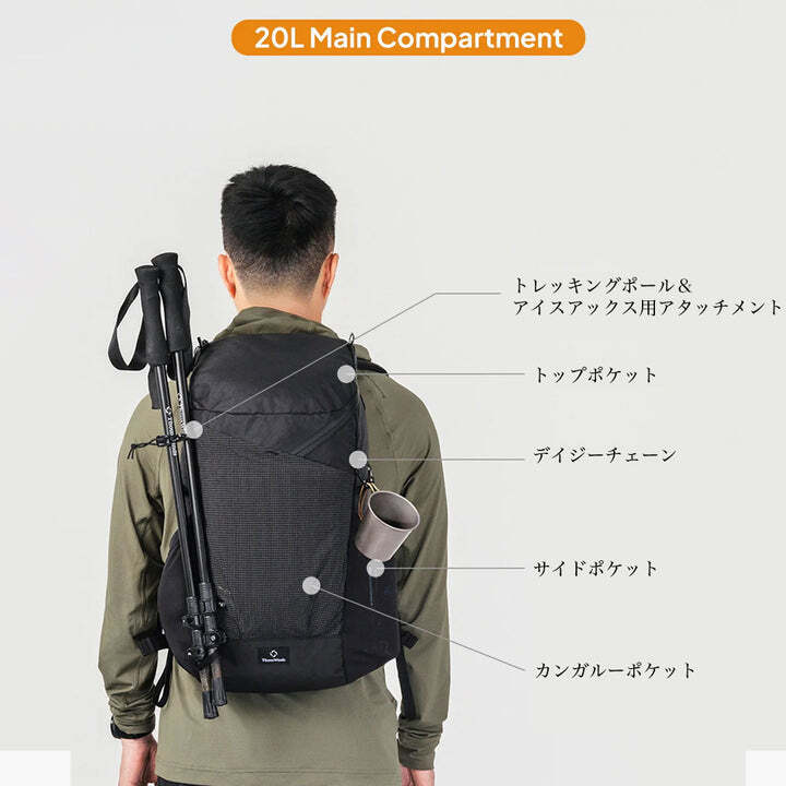 20L容量モデルで多くの荷物を収納可能です。